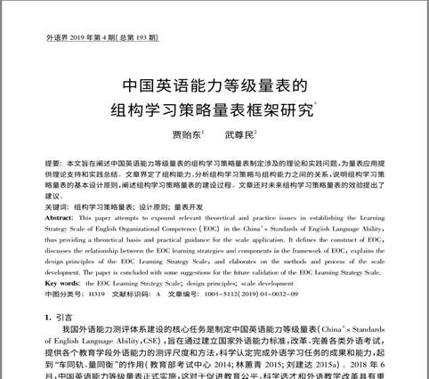 威尼斯人app 贾贻东副教授作为第一作者的论文《中国英语能力等级量表的组构学习策略量表框架研究》于2019年8月正式发表在《外语界》上(第4期,第32-40页)。该期刊是中文外国语类核心期刊和中文社会科学引文索引(CSSCI)》来源期刊,属我校A2类期刊。