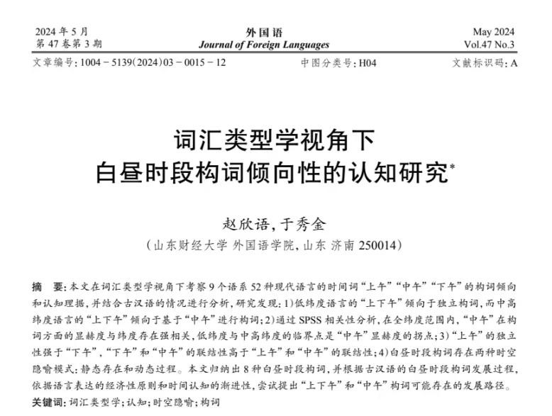 威尼斯人app于秀金教授(通讯作者)和研究生赵欣语同学合作的学术论文《词汇类型学视角下白昼时段构词倾向性的认知研究》在《外国语》2024年第3期发表。该刊在CSSCI“语言学(外国语文)”类期刊中位居第二,系我校A1类期刊。