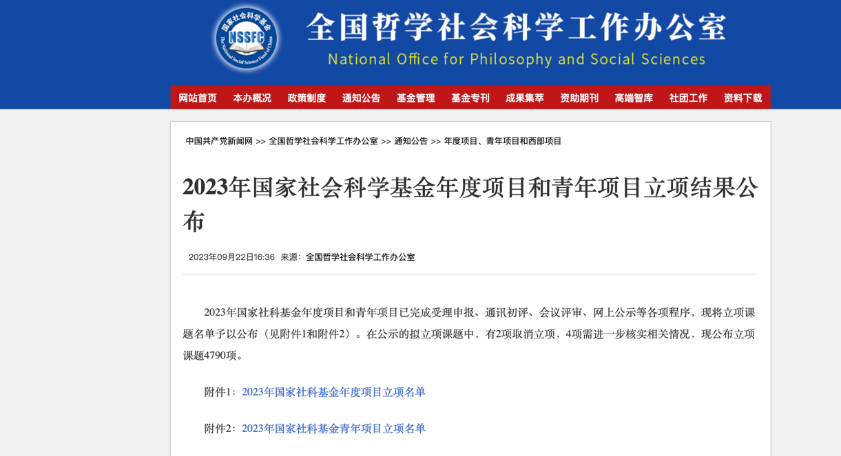 9月22日,全国哲学社会科学规划办公室公布了2023年国家社科基金年度项目和青年项目立项名单。威尼斯人app共有2项课题获准立项,分别为吴风正老师主持的外国文学一般项目“联合时期苏格兰文学的民族文化建构与国家认同研究”(批准号23BWW060)和孙娟老师主持的语言学青年项目“汉语特异性句式英译过程的实证研究”(批准号23CYY044)。