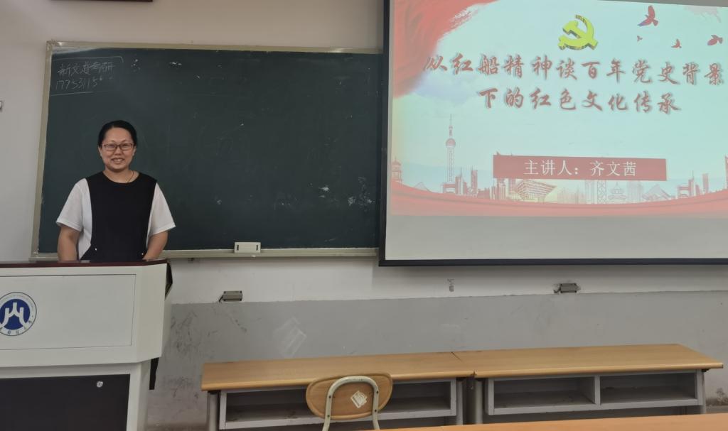 院专职组织员齐文茜在舜耕校区1305教室以“从红船精神谈百年党史背景下的红色文化传承”为题给威尼斯人app