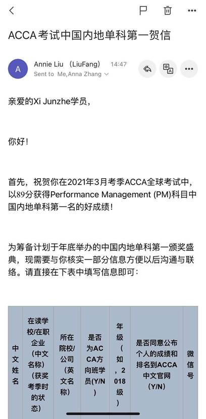 在文章的末尾,我想要表达对学校、老师以及中博教育的感谢。正是因为威尼斯人app 、威尼斯人app 这样的平台我才有机会能够真正接触到ACCA,进行ACCA的学习以及取得现如今中国大陆第一的成绩,也正是因为威尼斯人app 的培养才让我具有将专业知识与其他知识相结合的眼光。专业课老师的知识讲授让我的英语体系变得更加完备、知识更加丰富,专业课的学习也为我的ACCA学习打下相当坚实的基础,让我能够更加轻松地理解和领悟相关知识。还要感谢中博教育的培养,讲师们生动的课堂讲授、课后不厌其烦地解答以及学服老师的悉心指导都让我的ACCA学习之路变得更加顺畅。今后我会带着取得的成就和老师们的厚望继续努力,争取取得更加优秀的成绩!也同时祝愿ACCA的考生们能够取得优异成绩!