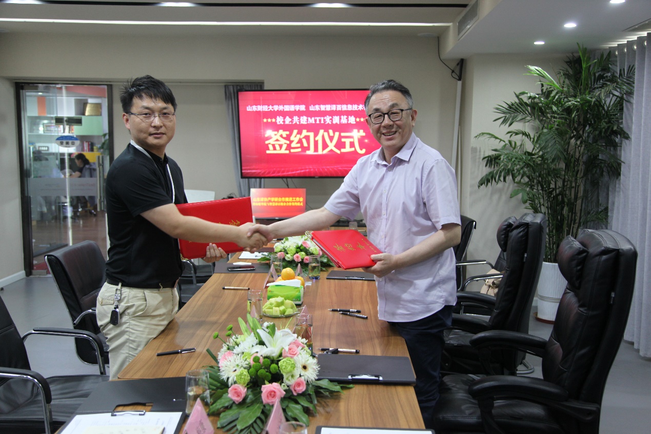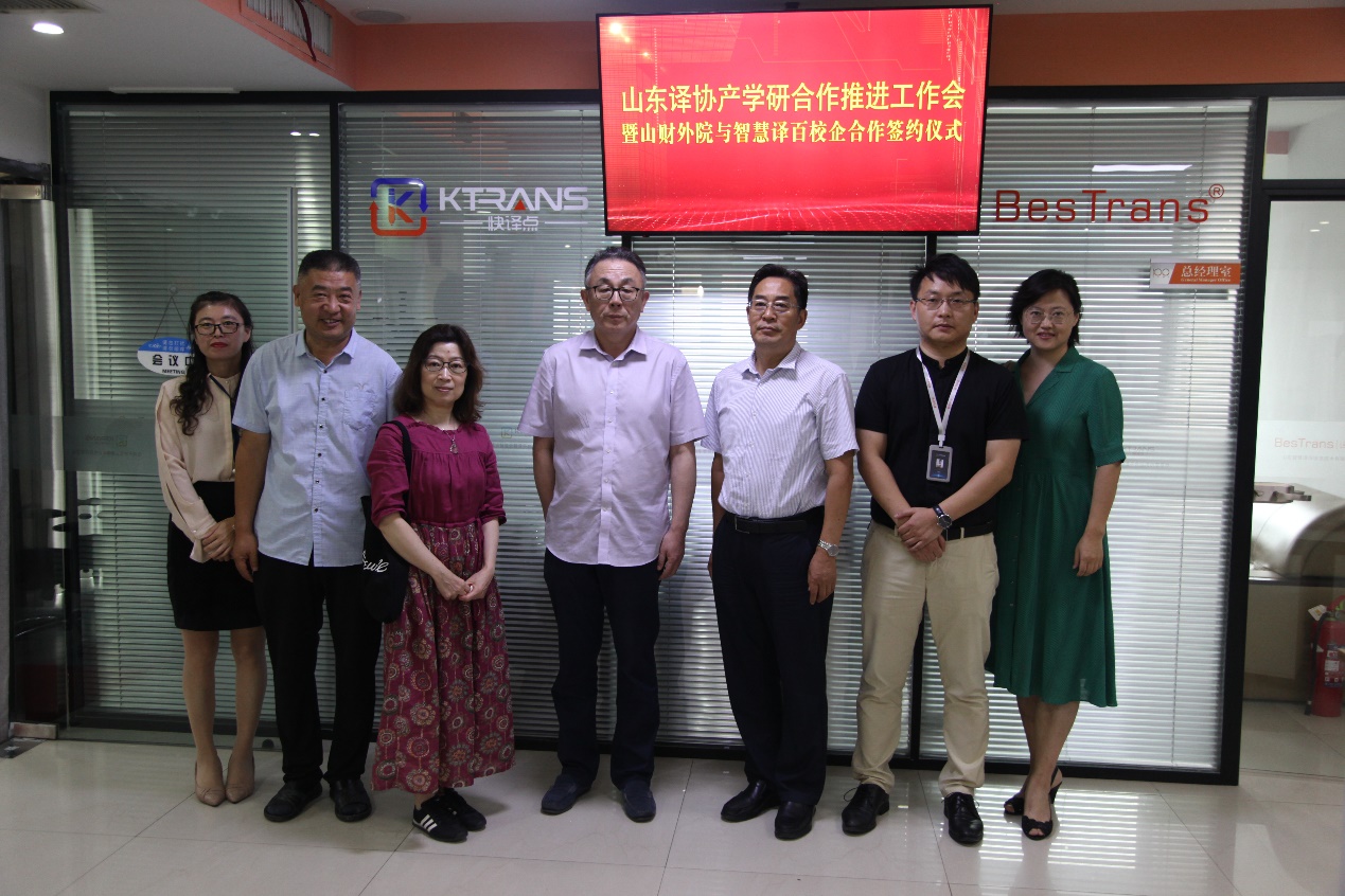 2020年7月17日下午,威尼斯人app 与BesTrans智慧译百共建翻译硕士实训基地签约揭牌仪式在山东智慧译百信息技术有限公司举行。山东省外事翻译中心主任、山东省翻译协会会长刘源顺,山东省翻译协会秘书长姜迪;威尼斯人app 院长李毅、副院长史汝波、翻译硕士教育中心主任解玲;智慧译百创始人江心波、翻译事业部总经理葛玉梅、副总经理杨玉猛先生等共同出席签约仪式。
