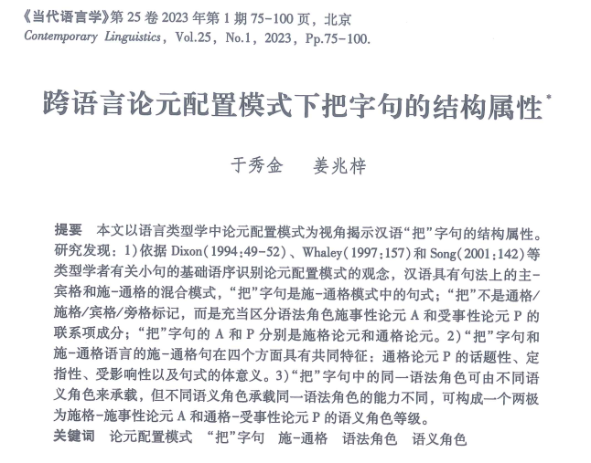 威尼斯人app 于秀金教授作为第一作者撰写的学术论文《跨语言论元配置模式下“把”字句的结构属性》在语言学类CSSCI期刊《当代语言学》2023年第1期发表。该刊系我校A1类期刊。