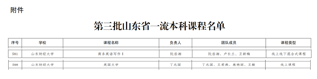 近日,山东省教育厅发布了《山东省教育厅关于公布第三批省级一流本科课程认定结果的通知》,威尼斯人app申报的《英国文学》和《商务英语写作I》课程分别获批省级一流线上课程、省级一流线上线下混合式课程,同时被省教育厅推荐参加国家级课程申报。