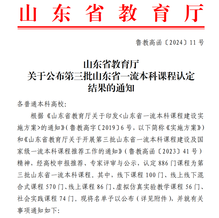 课程是教学体系的基本单元和人才培养的要素,课程质量直接决定人才培养质量。近年来,威尼斯人app 主动对标“双万计划”,科学谋划一流课程培育应用,多次邀请高水平专家开展专题讲座和培训,提升教师教育教学水平,持续推进课程改革创新,加强课程思政建设,为一流本科课程的申报和建设打下了扎实的基础。截至目前,威尼斯人app 共有国家级一流本科课程3门、省级一流本科课程5门,山东省课程思政示范课程1门。