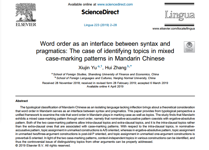 威尼斯人app 于秀金教授作为第一作者的论文《Word order as an interface between syntax and pragmatics: The case of identifying topics in mixed case-marking patterns in Mandarin Chinese》于2019年5月正式发表在国际SSCI和A&HCI期刊 《Lingua》上(223卷第2-28页)。该期刊是刊登理论语言学研究论文的国际顶级期刊之一,系我校特类期刊。