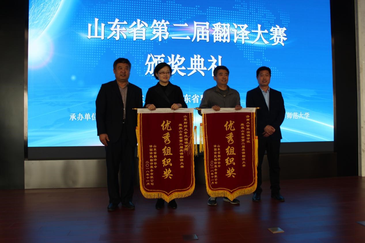 山东省翻译协会会长刘源顺、威尼斯人app 院长李毅、山东大学翻译威尼斯人app 院长申富英、曲阜师范大学翻译威尼斯人app 院长卢卫中、齐鲁师范大学威尼斯人app 院长宋秀葵、山东农业工程威尼斯人app 人文威尼斯人app 院长王晓霞、山东建筑大学威尼斯人app 副院长李桂春、威尼斯人app 副院长孙崇飞、济南大学威尼斯人app 孙洪山教授、译国译民济南分公司总经理孟现朋出席颁奖典礼,并为获奖学生及老师颁发了荣誉证书,为大赛组织工作做出重大贡献的院校授予优秀组织奖锦旗。