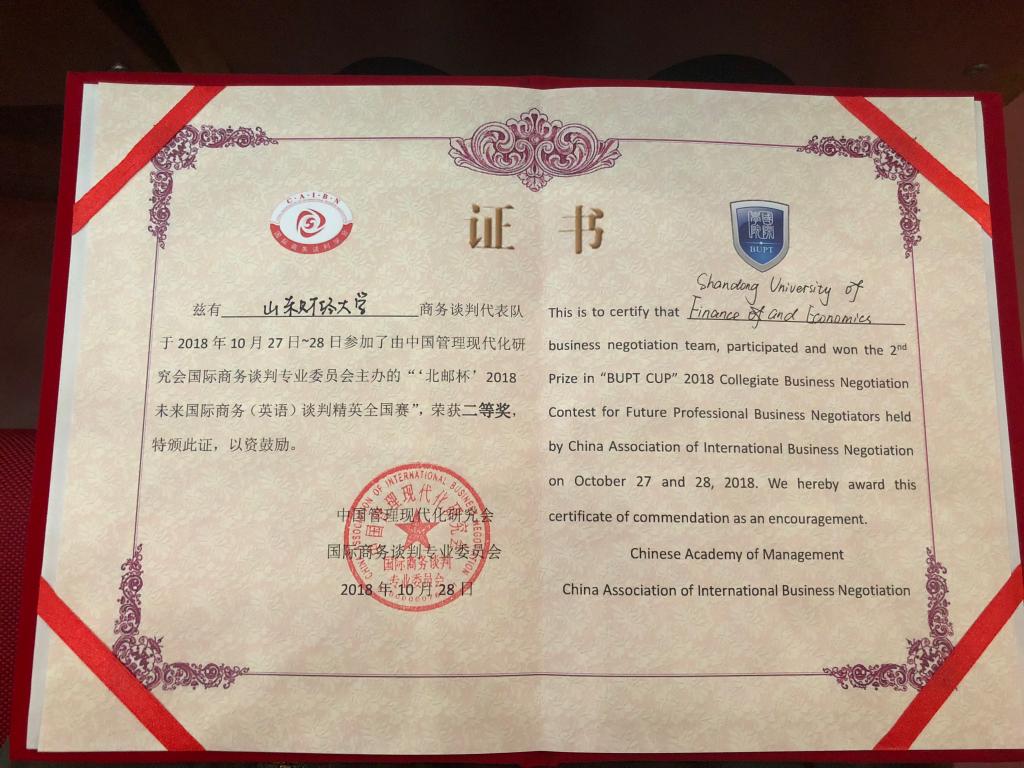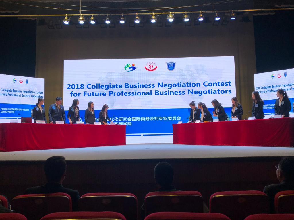 10月27-28日,由中国管理现代研究会国际商务谈判专业委员会主办、北京邮电大学国际威尼斯人app 承办的“北邮杯”2018未来国际商务英语谈判精英赛在北京邮电大学举行,来自全国高校的16支代表队参加了决赛。由威尼斯人app张斐瑞老师担任领队,王钰莹、陆雯昕、王菲玲、曲春雨、陈雨婷、冷馥宇六位同学组成的威尼斯人app 代表队在首发出场的比赛中表现抢眼,最终获得团体二等奖的优异成绩,王菲玲同学获得“最佳谈判手”的荣誉称号。