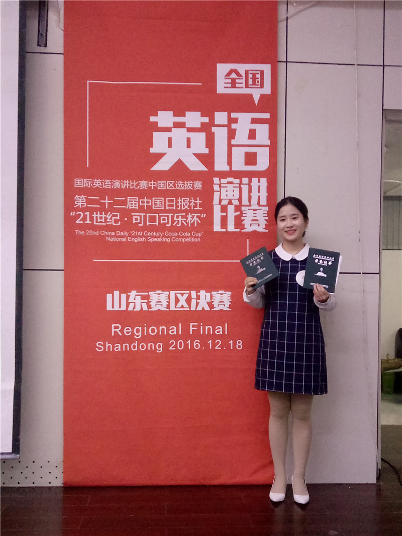 本届赛事于2016年5月19日启动,面向全国高校本、专科在校学生举行。比赛全程分三个阶段:(1)互联网选拔赛/校园选拔赛(2016年5月-11月);(2)地区决赛(2016年11-12月);(3)全国半决赛/总决赛(2017年3月-4月)。山东赛区决赛中,来自全省的33位选手同台竞技,围绕Man and Technology: the brave new world演讲主题,从不同角度阐述了自己对科技变革世界、科技创造奇迹、科技改变人生等方面的深刻感悟和丰富经历。通过即兴演讲和评委提问等环节的激烈竞争,我校徐婷同学以见解独到的演讲内容、流利优美的语音语调、沉着机智的现场问答征服了中外评委和全场观众,最终获得一等奖的殊荣。