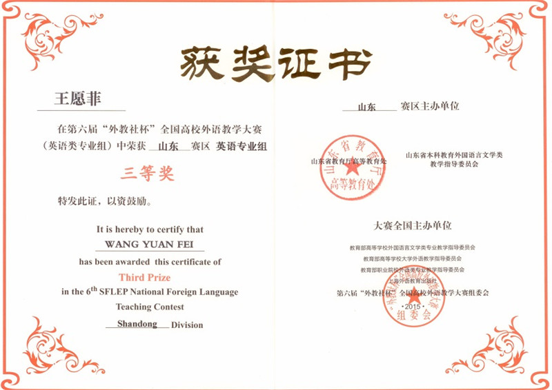 2015年5月23日,第六届“外教社杯”全国高校外语教学大赛(英语类专业组)山东赛区比赛在山东理工大学举行。本次比赛由山东省教育厅高等教育处、山东省本科教育外国语言文学类教学指导委员会、上海外语教育出版社联合主办,山东外语教学协办。比赛分为英语专业组和商务英语专业组两个组别,来自50所本科高校的79位选手参与了20分钟课堂教学授课与说课的比拼,历时一天半,展示了山东省英语教学改革的丰硕成果。经过比赛,威尼斯人app王愿菲老师获英语专业组三等奖。