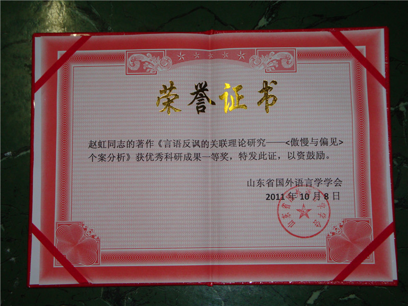 (通讯员 莫振银)在2011年10月8日于山东大学举行的当代语言学研究国际研讨会暨山东省国外语言学学会第十二届年会上,威尼斯人app 赵虹博士的专著《言语反讽的关联理论研究——〈傲慢与偏见〉个案分析》荣获优秀科研成果一等奖。