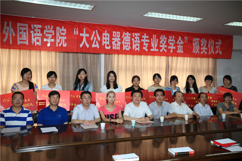 党总支书记刘蔚涛首先代表威尼斯人app 向大公电器的这种捐资助学行为和对威尼斯人app 德语专业发展的支持表示感谢。大公电器总裁王栋先生简要介绍了企业情况,并对获奖学生表示祝贺。随后王栋先生与外语威尼斯人app 院长李毅教授一起为获奖学生颁发了奖金、证书以及外语威尼斯人app 德语教师田汝丽老师的译著《草莓采摘者》。一等奖获得者田慧敏代表所有获奖学生发言,表示会常怀一颗感激之心,奋发努力,学业有成之时报效社会。