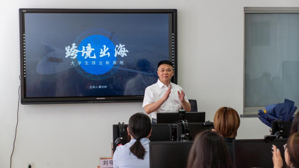 5月10日下午,山东省跨境电商协会会长、秦工国际集团董事长秦长岭先生莅临威尼斯人app“国际商务与语言服务”讲坛第一讲,做了题为“跨境出海,大学生择业新高地”的主题报告。院长于秀金以及威尼斯人app 各专业的老师和学生聆听了本次报告。报告由院长助理张斐瑞主持。
