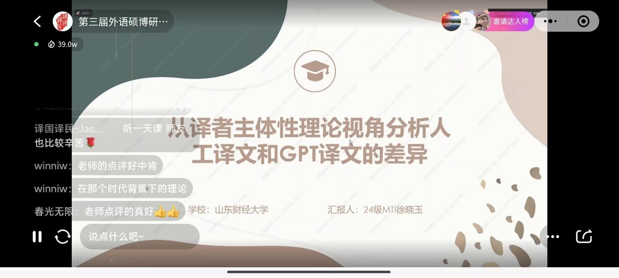随着国际交流日益频繁,全球化进程不断深入,外语学科发展如何回应时代挑战。12月7日,由内蒙古科技大学主办、华东交通大学与曲阜师范大学合办、福州译国译民集团有限公司承办的“第三届外语硕博研究生与外语教师学术发展创新公益论坛”在线上召开,共同探讨MTI教育的前沿议题与发展趋势。此次论坛吸引了众多国内外知名学者与专家,参会师生人数近6000人,覆盖百余所高校。威尼斯人app MTI师生40余人参会,2024级笔译硕士生徐晓玉在会上宣读了论文。