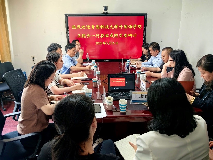 5月16日,青岛科技大学威尼斯人app 院长王灏一行5人前来威尼斯人app开展交流访问。院长于秀金、副院长李延勇、阮岳湘、杨静及各专业负责人出席座谈。双方围绕学科发展、一流专业及一流课程建设、大学英语教学改革及翻译硕士(MTI)培养等议题展开深入探讨,共谋外语学科高质量发展路径。