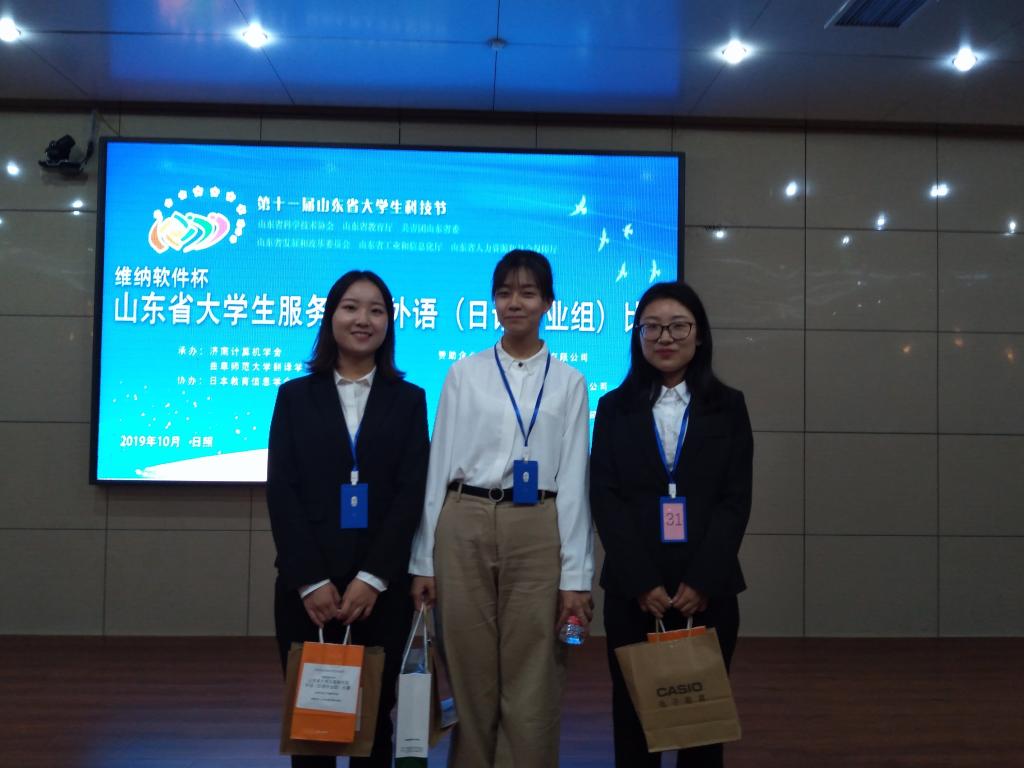 山东省大学生服务外包外语日语专业组大赛是“第十一届山东省大学生科技节”系列活动之一,由山东省科学技术协会、共青团山东省委员会、山东省发展和改革委员会、山东省教育厅、山东省工业和信息化厅、山东省人力资源和社会保障厅联合主办,山东省高教学会计算机教学研究专业委员会、济南计算机学会、曲阜师范大学翻译威尼斯人app 承办,日本教育信息学会协办,是山东省重要的日语专业赛事活动。比赛进行方式为现场日语即席演讲,会议前一天评委组商议决定即席演讲待选题目(5个),选手决赛上场前10分钟抽签决定演讲题目。日语专业2016级朱文星(指导教师王维维)、高夕婷(指导教师刘清哲)同学分获二等奖、于露(指导教师张燕)同学获得三等奖。
