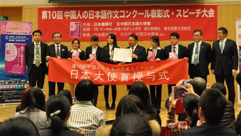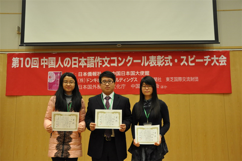 12月12日,由日本侨报社和日中交流研究所共同主办的第十届全国日语作文大赛颁奖仪式在日本大使馆隆重举行。本次大赛共有来自全国196所院校的4133人参赛,参赛人数创历史新高,竞争空前激烈,威尼斯人app学生的获奖人数在全国各参赛高校中名列榜首。日语专业2012级的陈谦同学获得一等奖,日本驻华大使木寺昌人亲自向其颁发了奖状和奖品。2012级的姚怡然、2011级的申皓获得三等奖。获奖同学在日语专业副主任冯晶副教授和外教新村美有纪的带领下,参加了颁奖仪式。颁奖嘉宾有日本驻华大使木寺昌人,北京日本学研究中心主任、中国日语教学研究会会长徐一平以及来自东芝株式会社、中国日本商会等知名企业界的代表。日本朝日新闻、NHK等各大媒体全程报道。