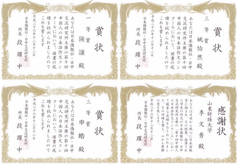 作为我校首届外语技能系列大赛的一个环节,威尼斯人app 日语专业于今年5月组织了日语写作大赛,赛后安排教师对优秀学生进行了精心指导,并推荐参加了国内日语界规模、影响最大的赛事之一--“第十届全国日语作文大赛”。本次大赛以“ACG(动画、漫画、游戏)和我”、“公共礼仪与中国人”为主题,历时5个月,经过4轮严格的评审,最终评选出特等奖1名,一等奖5名,二等奖15名,三等奖40名。另外,陈谦和姚怡然同学的指导教师新村和申皓同学的指导教师李文秀获得了主办方颁发的“感谢状”,新村还被委托为新一届作文大赛的“推广大使”。