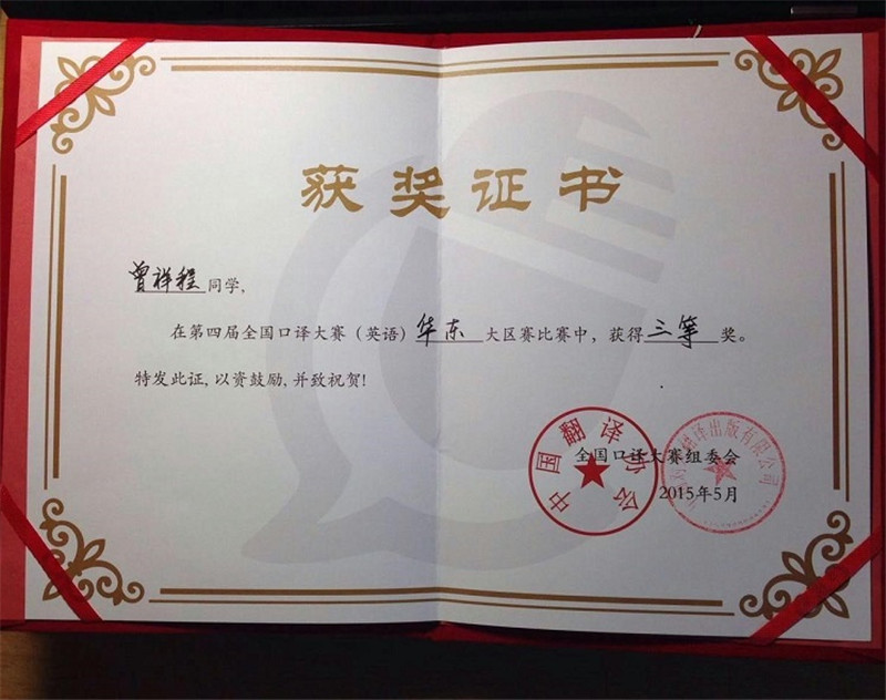5月17日,由中国翻译协会语言服务能力与评估中心主办、南京师范大学承办的第四届全国口译大赛华东大区赛在南京举行。来自华东六省一市的近百名优秀学子为进入全国总决赛展开激烈角逐。威尼斯人app2014级翻译硕士曾祥程同学在指导教师张明彬的带领下参赛,荣获三等奖。